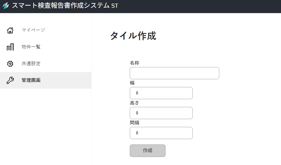 3.タイル作成の画面になります。タイルの「名称」「幅」「高さ」「間隔」をそれぞれ入力し、「作成」ボタンをクリックで完了。