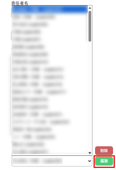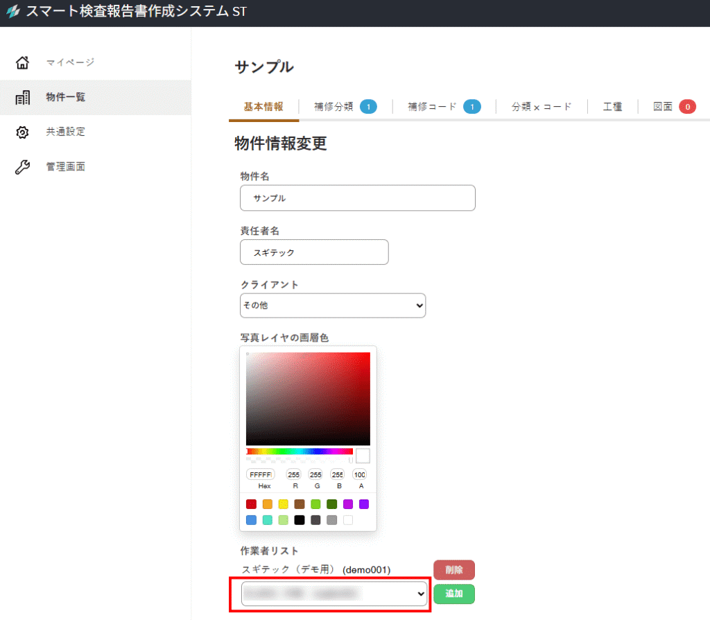 3.物件情報変更 画面の「作業者リスト」項目のリスト欄をクリックすると、登録されているユーザーが選択リストに表示されます。この中から物件にアクセスできるユーザーを選択し、「追加」ボタンをクリックしてください。