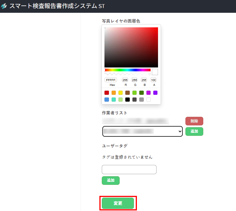 4.作業者リストの項目に、追加してユーザーが表示されます。続けて追加したい場合は、手順3を再度おこなってください。追加が終わったら「変更」ボタンをクリックすれば完了です。