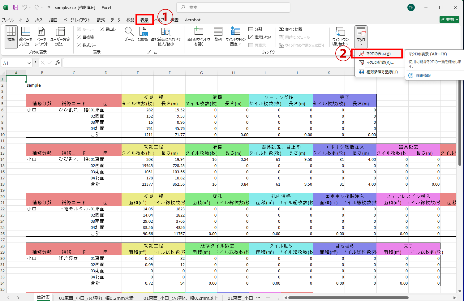 8.次に数量表のエクセルを開きます(修復しますか?などのウィンドウが出てきた場合は「はい」を押してください)。次に、①エクセルのメニュー「表示」をクリックし、②表示メニューにある「マクロ」の「マクロの表示」をクリックします。