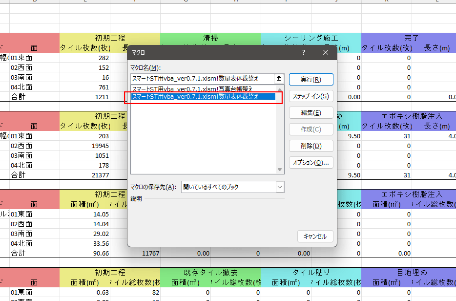 9.すると実行できるマクロが表示されるので「スマートST用vba_ver0.7.1.xlsm!数量表体裁整え」を選択し「実行」ボタンをクリックしてください。