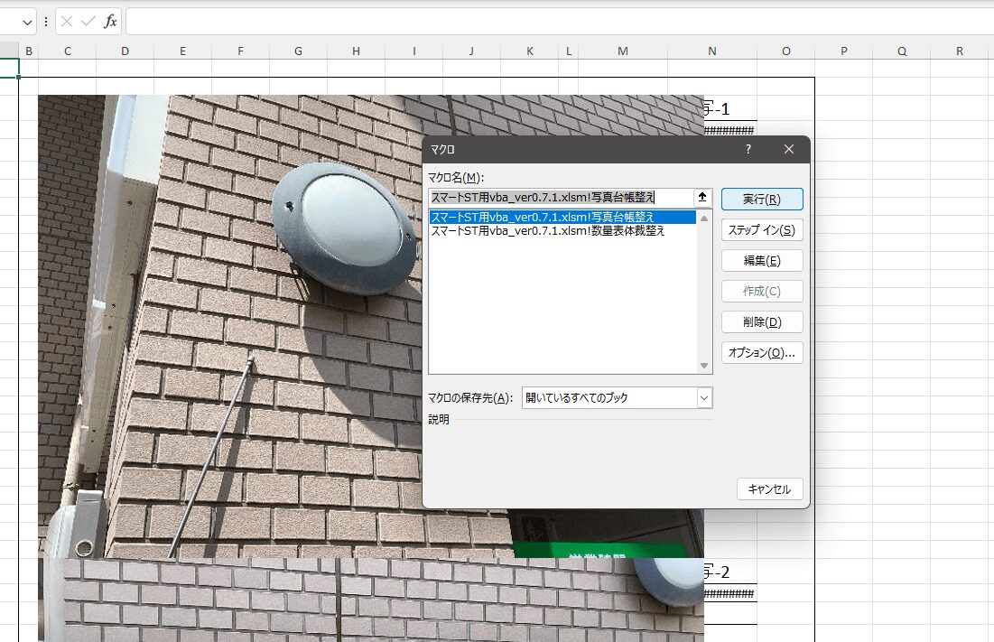 12.エクセルの「表示」メニューから「マクロ」にある「マクロの表示」をクリックし、今後は写真台帳を整える用のマクロ「スマートST用vba_ver0.7.1.xlsm!写真台帳裁整え」を実行します。
