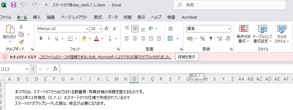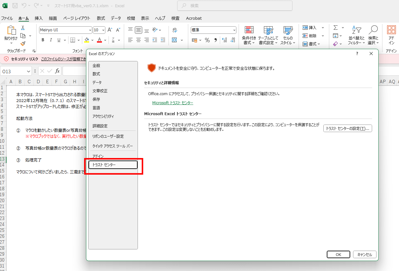 7.再び「スマートST用vba_ver0.7.1.xlsm」を開くと、警告が出なくなります。この「スマートST用vba_ver0.7.1.xlsm」は開いたままにしておいてください。