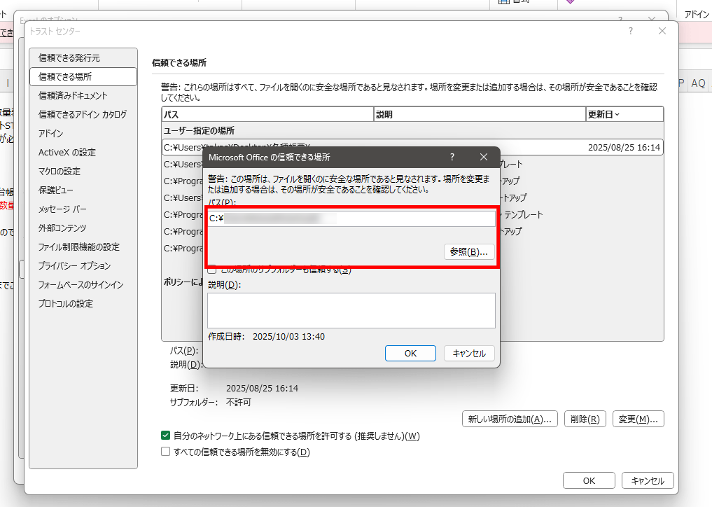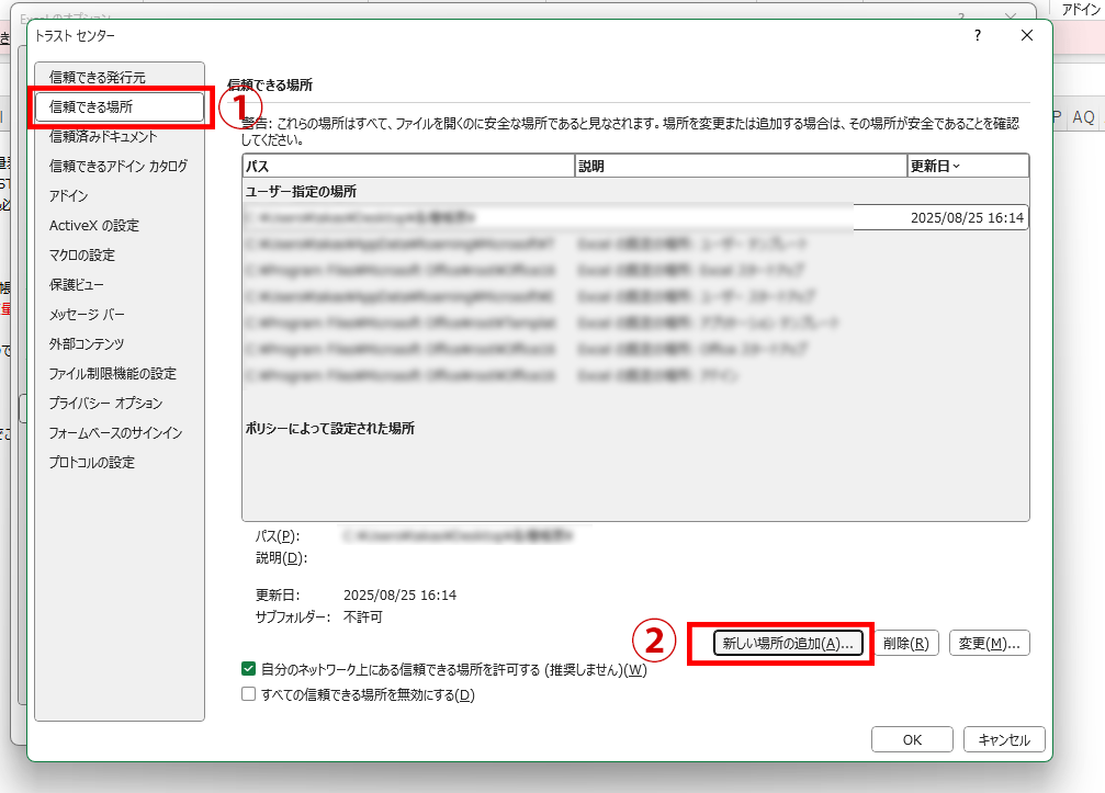 5.トラストセンターウィンドウが開きます。①左側メニューの2番目にある「信頼できる場所」をクリックし、続けて右側画面の②「新しい場所の追加」をクリックします。